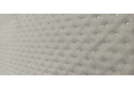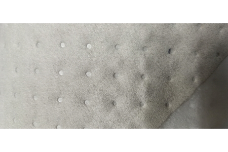 Trwała ,pikowana tkanina obiciowa doskonale imitująca zamsz w kolorze jasnego popielu.